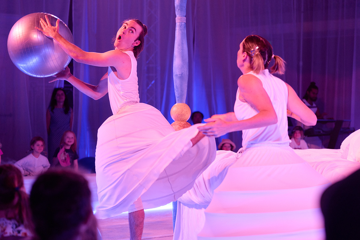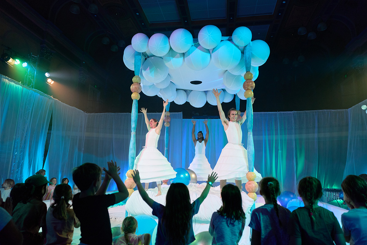- Blends puppetry, clowning, music, and movement with immersive effects and audiences seated on bouncy balls close to the performers.